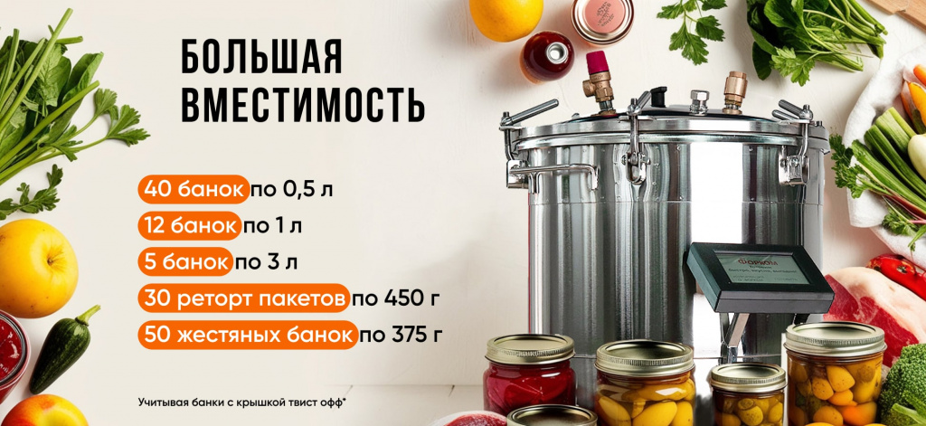 Начинающим подойдут 4 предустановленных режима для рыбы, птицы, мяса, плодов и ягод. Опытные консерваторы могут создавать и запоминать до 10 собственных программ, для любого вида тары в блоке управления. Аппарат поддерживает стабильное давление и температуру, в соответствии с требованиями к консервированным продуктам, позволяя закатывать даже в реторт-пакеты.