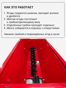 Виноград скользит по стенкам бункера (5) на пару роликов (8), где производится его дробление. После того, как он раздроблен, подается к гребнеотделительному валу (1), где отделяются стебли. Далее виноград поступает в корзину с отверстиями (2) и попадает в предварительно подставленную под машину емкость.